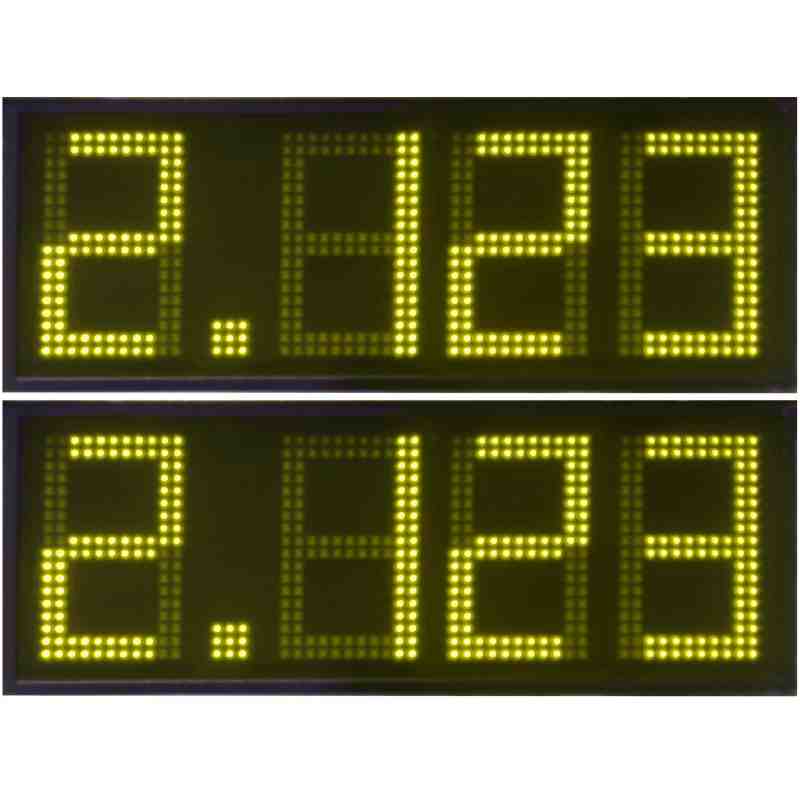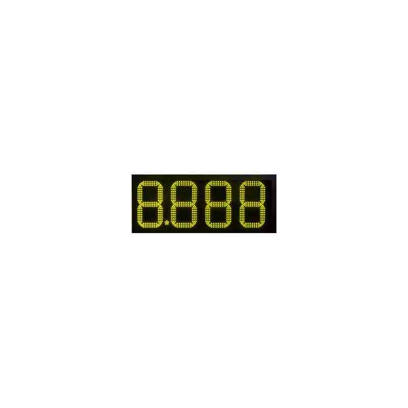 Pantalles del led de 50 cm. d'altura en color groc per integrar en monòlits de gasolineres i visualitzar els preus del combustible. Realitzats amb díodes leds d'alta lluminositat (8000 mcd) i 120 graus d'angle sòlid. Inclosos en caixa d'alumini lacat amb frontal de metacrilat antireflectant per assegurar la millor visió amb incidència directa de llum solar.