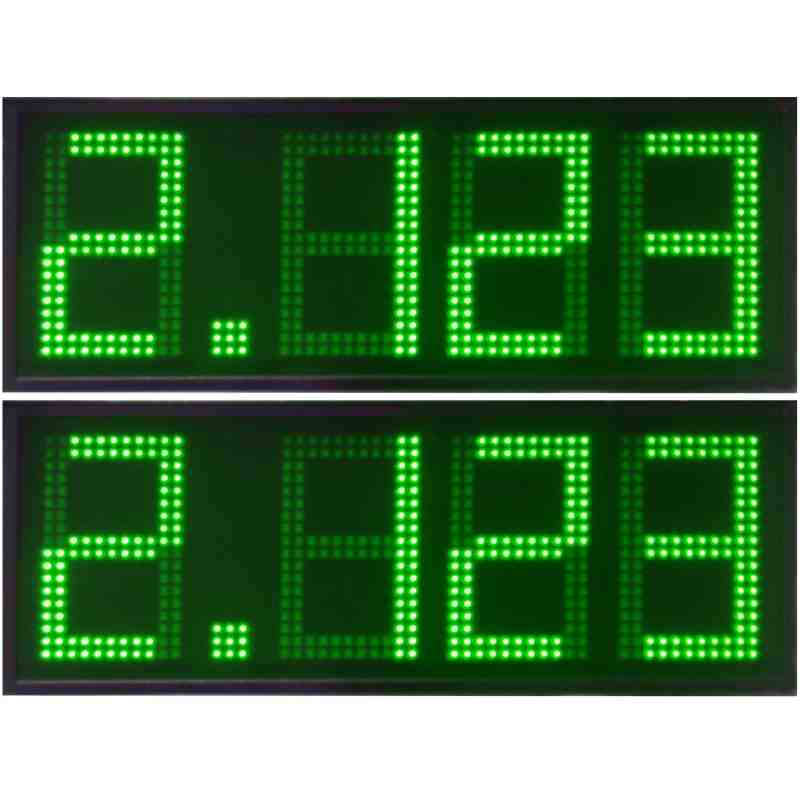 Displays de led de 27 cm. de altura en color verde para integrar en monolitos de gasolineras y visualizar los precios del combustible. Realizados con diodos leds de alta luminosidad (8000 mcd) y 120 grados de ángulo sólido. Incluidos en caja de aluminio lacado con frontal de metacrilato antirreflectante para asegurar la mejor visión con incidencia directa de luz solar.