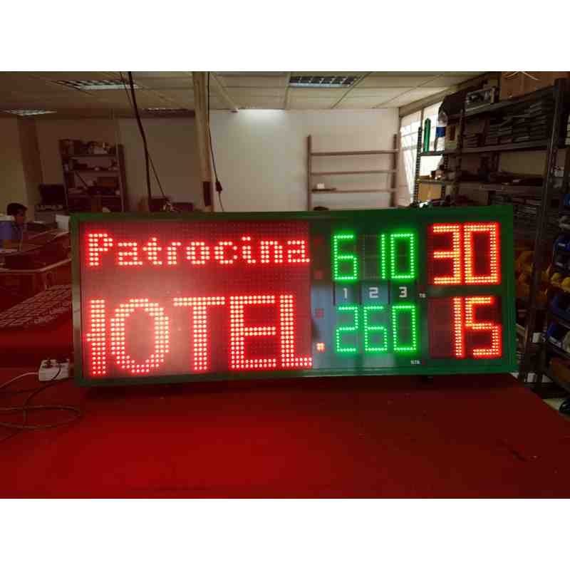 Segnapunti elettronico per il tennis fatto di cifre di 18 cm. di altezza. Preparato per la visualizzazione del risultato di fino a 3 set giocati, con il risultato della partita giocata. Indicazione di Break controversia Tie e il risultato. Punti Giocatore indicatori nel reparto sia in modalità singola e coppie di modalità. Comando e console di progettazione dei controlli tennis specifico, inclusa in valigetta. Pannelli per la schermata del nome del giocatore s.